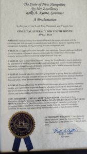 Governor Ayotte acknowledged that “personal financial education is essential for ensuring that the youth of New Hampshire are prepared to manage money and credit wisely and responsibly.” She recognized the “concerned professionals of NH Jump$tart who volunteer their time and energy to promote financial education for New Hampshire’s youth to meet these educational goals.” In proclaiming Financial Literacy for Youth Month, Governor Ayotte “call(ed) upon the citizens of this state to encourage and support” the efforts of NH Jump$tart.